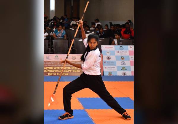 கோவை ஈச்சனாரி கற்பகம் பல்கலை நடந்து வரும் தேசிய அளவிலான சிலம்ப போட்டியில் தன் திறமையை வெளிப்படுத்திய மாணவி.