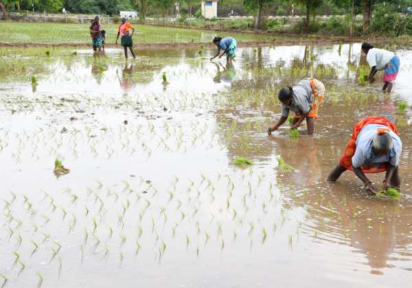 கோடை மழை பெய்ததையடுத்து திண்டுக்கல் அருகே முத்தனம்பட்டி பகுதியில் நெல் நாற்று நடவு பணி நடந்தது.