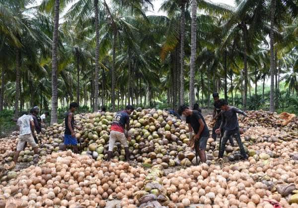 தென்னை தோப்புகளில் பறிக்கப்பட்ட தேங்காய்களை உரிக்கும் தொழிலாளர்கள். இடம்.உடுமலை
