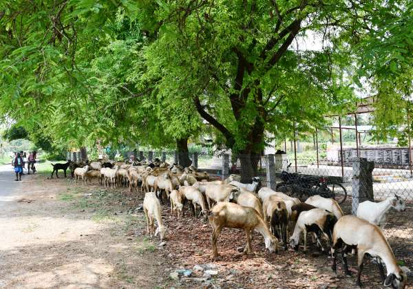 கடந்த ஒரு வாரமாக வெயில் தாக்கம் அதிகரித்துள்ளதால் ஆடுகள் மேய்ய முடியாமல் மரத்தின் நிழலில் ஒதுங்கியது. இடம்.திண்டுக்கல் மாவட்டம் தெத்துப்பட்டி.