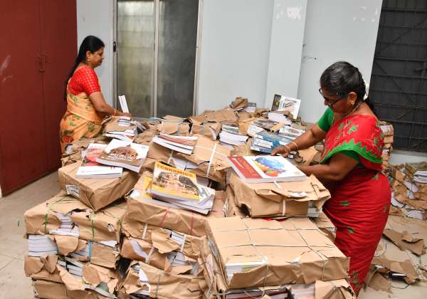 கோடை விடுமுறை முடிந்து பள்ளிகள் திறக்கப்பட உள்ள நிலையில், மாணவர்களுக்கு வழங்கப்பட உள்ள புத்தகங்களை அடுக்கி வைக்கும் பணியில் ஈடுபட்டுள்ள ஆசிரியர்கள். இடம் : மாநகராட்சி பெண்கள் மேல்நிலைப் பள்ளி, ஷெனாய் நகர்