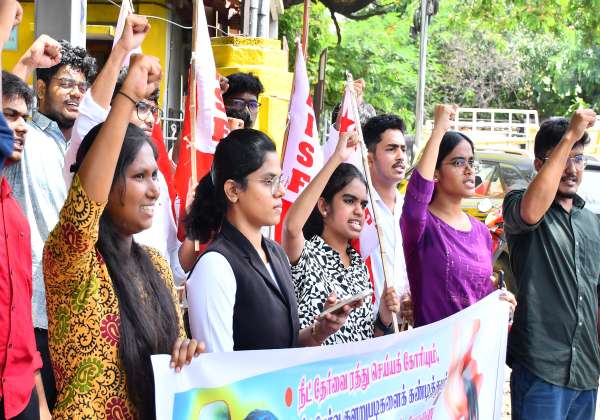 நீட் தேர்வுக்கு எதிராக கோவை பி.எஸ்.என்.எல்., அலுவலகம் முன்பு ஆர்பாட்டத்தில் ஈடுபட்ட ஏ.ஐ.எஸ்.எப்., அமைப்பினர்.