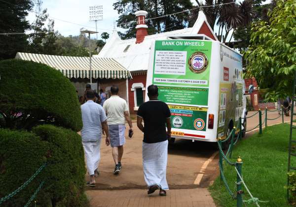 ஊட்டி தாவரவியல் பூங்காவில், நடைபாதைக்கு இடையுறாக நிறுத்தப்பட்டுள்ள கூட்டுறவு வங்கி ஏ.டி.எம்., வாகனம்.