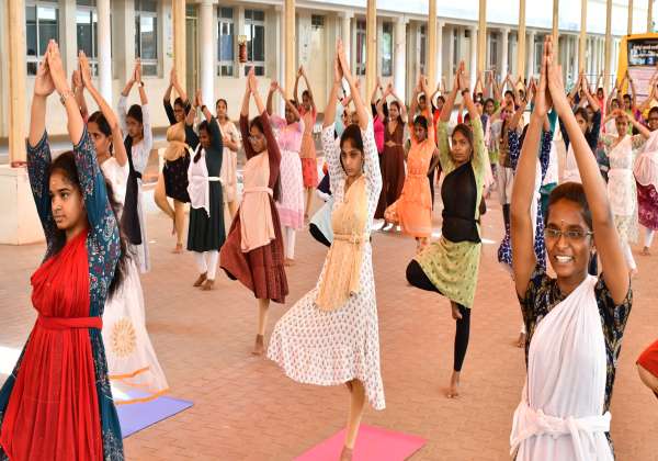 உலக யோகா தினத்தை முன்னிட்டு திருப்பூர், குமரன் மகளிர் கல்லூரியில் யோகா பயிற்சி செய்த மாணவியர்.