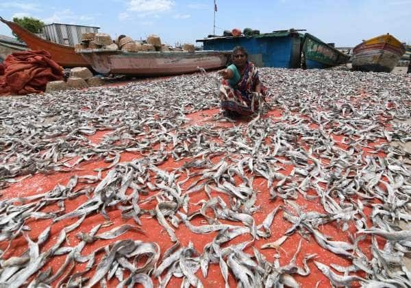 சென்னையில் நாளுக்கு நாள் வெயிலின் தாக்கம் அதிகரித்து வரும் நிலையில் கருவாடு காய வைக்கும் பணியில் ஈடுபட்டுள்ள பெண். இடம்: காசிமேடு மீன்பிடி துறைமுகம்.