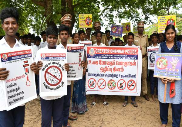 போதை ஒழிப்பு தினத்தை முன்னிட்டு அடையாறு சாஸ்திரி நகரில், போலீசார் பள்ளி மாணவர்களிடம் போதைப்பொருட்கள் குறித்த பிரசுரங்களை வழங்கி விழிப்புணர்வு ஏற்படுத்தினர். இடம்: பெசன்ட் நகர்.