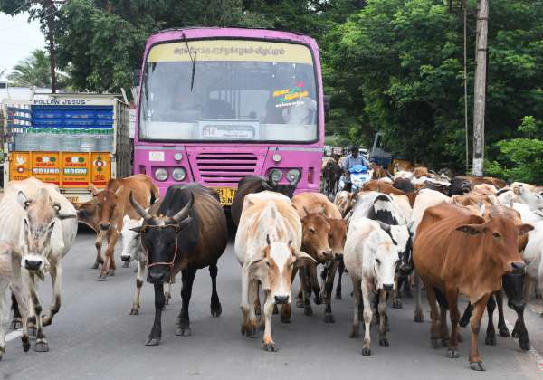 மாடுகள் சாலை மறியலா?...திருவள்ளூர் ஊத்துக்கோட்டை சாலை புதிய பஸ் நிலையம் அருகே சாலையில் மாடுகள் வருவதால் போக்குவரத்து பாதிப்பு