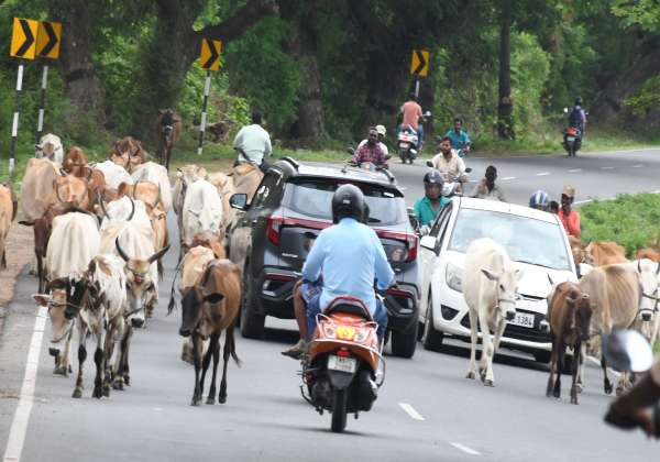 சாலையில் சுற்றி திரியும் மாடுகளால் வாகன ஓட்டிகள் அவதி அடைகின்றனர். இடம்: திருவள்ளூர்