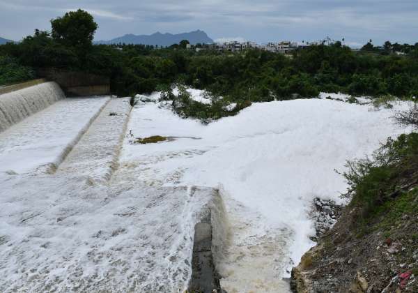 கோவை நொய்யல் ஆற்றில் வெள்ளப்பெருக்கு ஏற்பட்டுள்ள நிலையில், சாயக்கழிவுநீர்கள் கலப்பதால் ஆத்துப்பாலம் அருகே உள்ள சங்கிலி கருப்பன் தடுப்பணையில் கரைபுரண்டு ஓடும் வெள்ள நிற நுரைகள்.