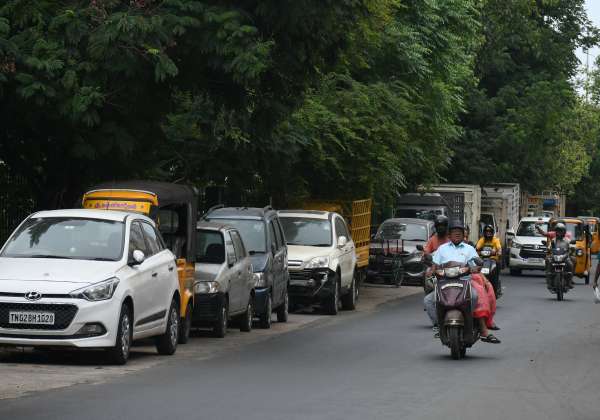 சென்னை மின்ட் பகுதியில் போக்குவரத்து இடையூறாக நிறுத்தி வைக்கப்பட்டிருக்கும் வாகனங்கள்.இடம்: நார்த்வால்சாலை.