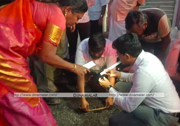 திருநெல்வேலி மாநகராட்சி பகுதியில் புதிதாக அமைக்கப்பட்ட தார் சாலையை ஸ்கேல் கொண்டு அளந்து தரத்தை ஆய்வு செய்கிறார் மாநகராட்சி கமிஷனர் தாக்கரே.