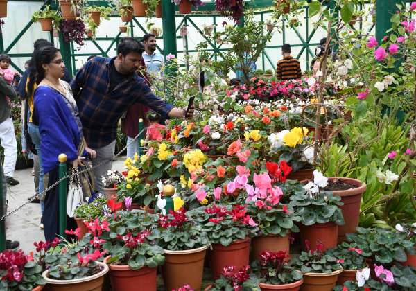 ஊட்டி தாவரவியல் பூங்கா, கண்ணாடி மாளிகையில் உள்ள பல வண்ண மலர்கள் ரசித்து செல்லும் சுற்றுலா பயணிகள்.