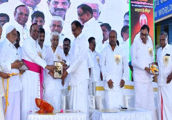 சிவகங்கை முன்னாள் எம்.எல்.ஏ.ராஜசேகரன் 85 வயது பிறந்த நாள் பாராட்டு விழாவில் விழா சிறப்பு மலரை சிவகங்கை மறை மாவட்ட பேராயர் லூர்து ஆனந்தம் வெளியிட அருகில் முன்னாள் மத்திய அமைச்சர் சிதம்பரம் பெற்றுக்கொண்டார்.அருகில் இடமிருந்து ஜமாஅத் தலைவர் காஜா மைதீன். முன்னாள் எம்.எல்.ஏ.ராஜசேகரன், முன்னாள் மத்திய அமைச்சர்கள் இளங்கோவன், திருநாவுக்கரசர், சி.பி.ஐ.மாநில செயலாளர் முத்தரசன்.