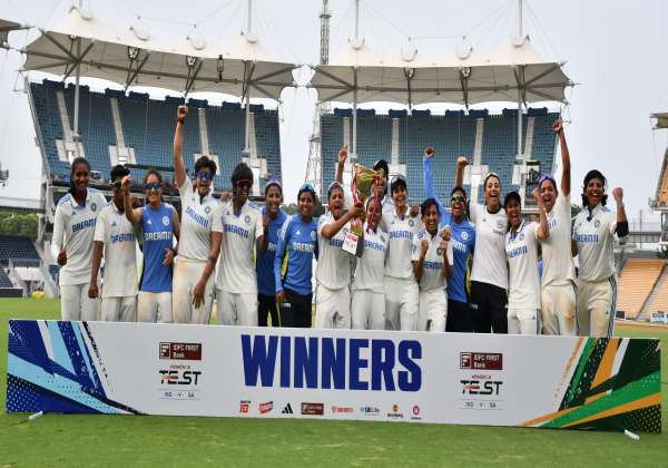 இந்தியா - தென் ஆப்ரிக்கா பெண்கள் கிரிக்கெட் டெஸ்ட் போட்டியில் வெற்றி பெற்ற இந்திய அணியினர் இடம் : சேப்பாக்கம், சென்னை