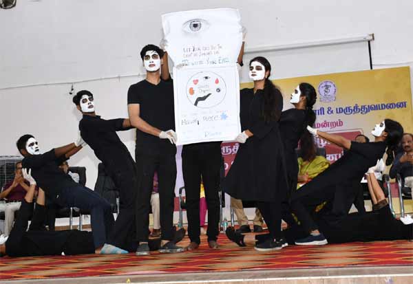 திருவண்ணாமலை அரசு மருத்துவ கல்லூரி மருத்துவமனையில், மருத்துவ தினம் மற்றும் உடலுறுப்பு தானம் பற்றி நடந்த கருத்தரங்கு நிகழ்ச்சியில் விழிப்புணர்வு ஏற்படுத்திய மருத்துவக் கல்லூரி மாணவ, மாணவிகள்.