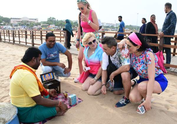 ஸ்பெயின் நாட்டிலிருந்து இந்தியாவிற்கு சுற்றுலா வந்தவர்கள் சென்னை மெரினா கடற்கரையில் தன் யோகம் எப்படி இருக்கு என்று கிளி ஜோசியம் பார்த்து மகிழ்ந்தனர்.