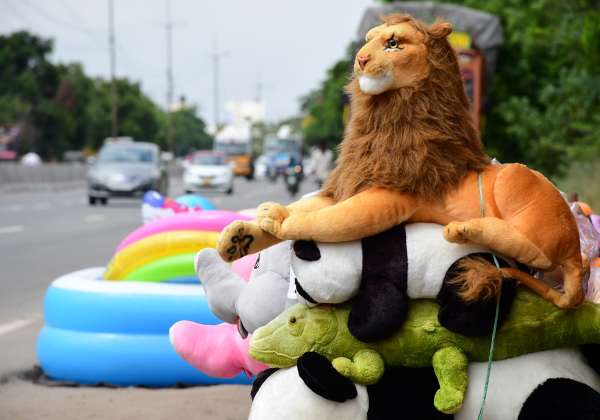 கோவை அவிநாசி ரோடு நீலாம்பூர் அருகே ரோட்டில் விற்பனைக்காக வைக்கப்பட்டுள்ள அழகிய பொம்மைகள்.