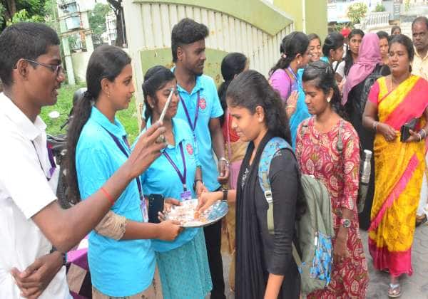 கோவை அரசு கலை கல்லூரிக்கு வந்த முதலாம் ஆண்டு மாணவ, மாணவிகளுக்கு பன்னீர் தெளித்து வரவேற்பு அளிக்கப்பட்டது.