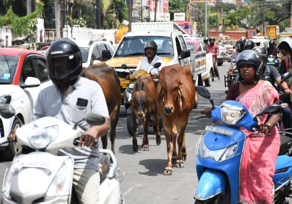 கேட்பாராற்று ரோட்டில் திரியும் மாடுகளால் வாகன ஓட்டிகளுக்கு ஆபத்தான சூழ்நிலை நிலவுகிறது. இடம் கோவை சாய்பாபா கோவில்.