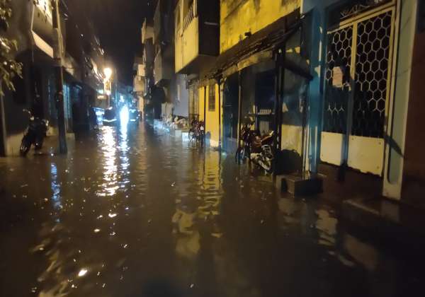 புதுச்சேரியில் இடி, மின்னல், சூறைக்காற்றுடன் பெய்த கன மழையால் நகரப் பகுதியில் உள்ள தம்புநாய்க்கார் வீதியில் உள்ள வீடுகளை சூழ்ந்த மழைநீர்.