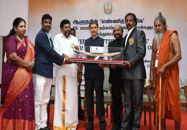 சென்னை கவர்னர் மாளிகையில் நடந்த எண்ணித் துணிக நிகழ்ச்சியில் பாரம்பரிய தற்காப்புக் கலை ஆசான்களுடன் கலந்துரையாடல் நிகழ்வில் கவர்னர் ரவிக்கு நினைவுப் பரிசு வழங்கிய தற்காப்புக் கலை ஆசான்கள்.இடம் : கிண்டி.