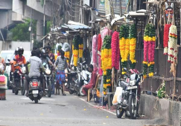 தாம்பரம் மேம்பாலத்தின் கீழ் அணுகு சாலையை ஆக்கிரமித்து வைக்கப்பட்டுள்ள பூ கடைகள்.