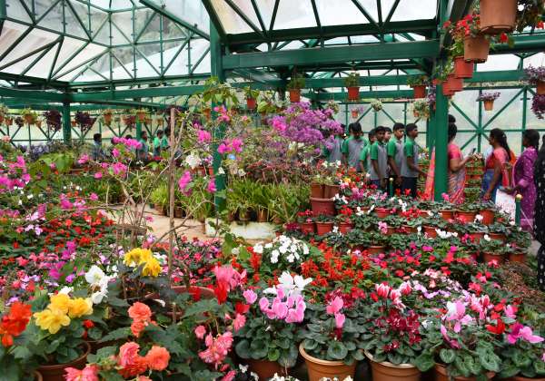 ஊட்டி தாவரவியல் பூங்கா கண்ணாடி மாளிகையில், பூத்து குலுங்கும் பூக்களை ரசித்து செல்லும் சுற்றுலா பயணிகள்.