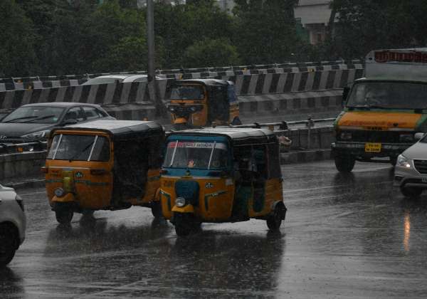 சென்னையில் மாலை பரவலாக பெய்த மழையில் நனைந்தபடி சென்ற வாகன ஓட்டிகள்.இடம்: ஆலந்தூர்.