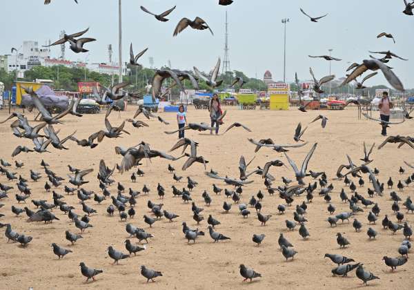 சென்னை மெரினா கடற்கரையில் இரை தேடும் புறாக்களை விரட்டி பிடித்து மகிழ்ந்த சிறுமி.