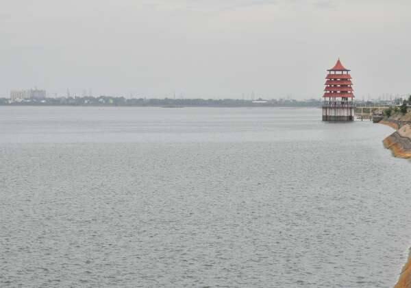 சென்னை மற்றும் புறநகர் பகுதிகளில் மழைபெய்து வருவதால் தண்ணீர் நிறைந்து கடல் போல் காட்சியளிக்கும் செம்பரம்பாக்கம் ஏரி.