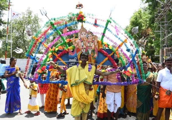 திண்டுக்கல் செல்லாண்டியம்மன் கோயிலில் உற்சவ விழாவை முன்னிட்டு அலகு குத்தி நேர்த்திக்கடன் செலுத்திய பக்தர்.