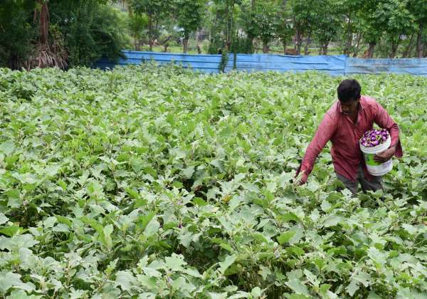 கத்திரிக்காய்யை விற்பனைக்காக அறுவடை செய்யும் விவசாயி. இடம். போரூர் அருகே உள்ள தெள்ளியார் அகரம்.