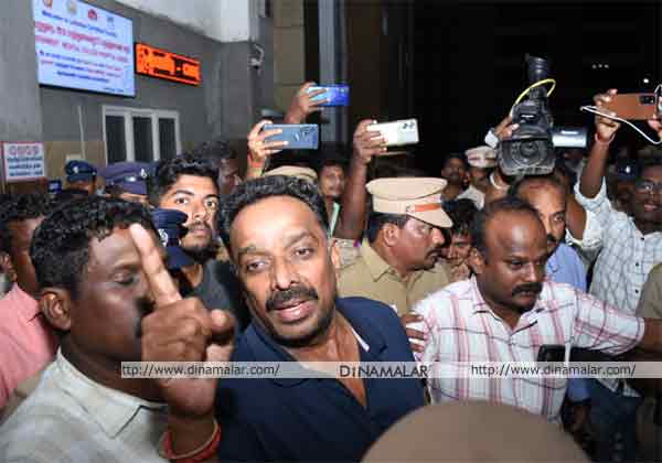 சிபிசிஐடி போலீசாரால் கைது செய்யப்பட்ட முன்னாள் போக்குவரத்து துறை அமைச்சர் விஜயபாஸ்கர் கரூர் அரசு மருத்துவக் கல்லூரி மருத்துவமனையில் பரிசோதனை முடித்து வெளியே வந்தவர் ஆவேசமாக கையை உயர்த்தி காட்டினார்.