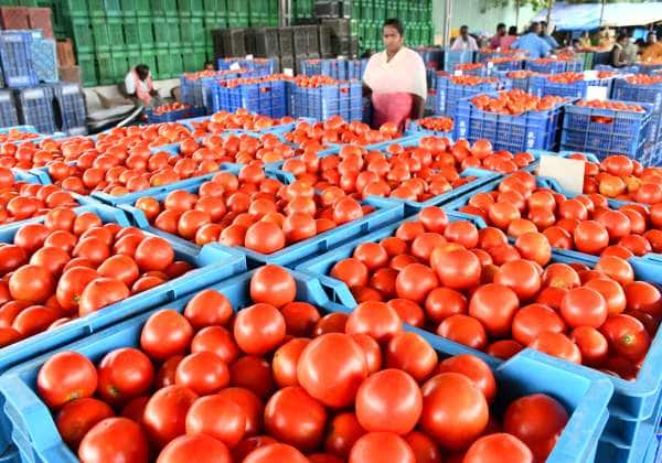 திருப்பூர், தென்னம்பாளையம் மார்க்கெட்டில் விற்பனைக்கு வைக்கப்பட்டுள்ள தக்காளி.