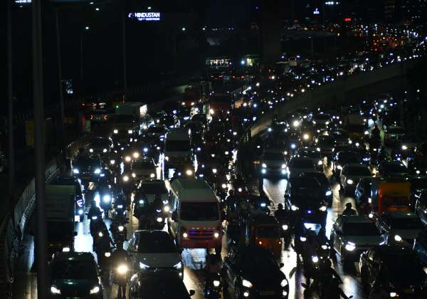 சென்னையில் மாலை பரவலாக பெய்த மழையால் கிண்டி கத்திப்பாரா மேம்பாலத்தில் ஏற்பட்ட போக்குவரத்து நெரிசலில் சிக்கி ஊர்ந்து செல்லும் வாகனங்கள்.