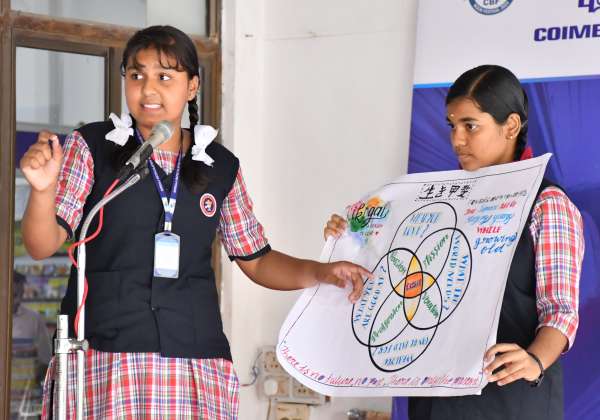கோவை கொடிசியாவில் நடந்து வரும் புத்தர் திருவிழாவில் நடத்தப்பட்ட பள்ளி மாணவர்களுக்கான பேச்சுப் போட்டியில் திறமையை வெளிப்படுத்திய மாணவி.