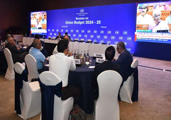 பார்லிமென்டில் மத்திய நிதி அமைச்சர் நிர்மலா சீதாராமன் மத்திய பட்ஜெட் தாக்கல் செய்தார். இதனை காணொளி வாயிலாக ஆர்வமுடன் பார்வையிட்ட சி.ஐ.ஐ., எனப்படும் இந்திய தொழில் கூட்டமைப்பு தமிழக பிரிவு நிர்வாகிகள். இடம்: கிண்டி.