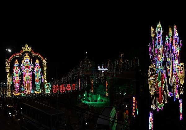 திருவள்ளூர் மாவட்டம் திருத்தணியில் ஆடிக்கிருத்திகை முன்னிட்டு சுப்பிரமணியசாமி கோவிலில் செல்லும் சாலையில் மின்விளக்கு ஜொலிக்கிறது