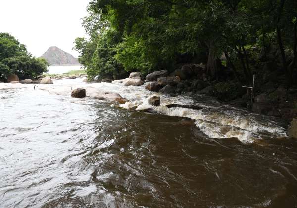 உடுமலை பஞ்சலிங்க அருவியிலிந்து வரும் தண்ணீர் திருமூர்த்தி அணைக்குள் பாய்ந்து செல்கிறது.