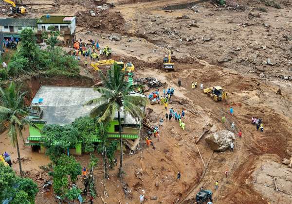 வயநாடு முண்டக்கை பகுதியில் நிலச்சரிவு நடந்த பகுதியில் தேடுதல் பணியில் ஈடுபட்ட மீட்பு படையினர்