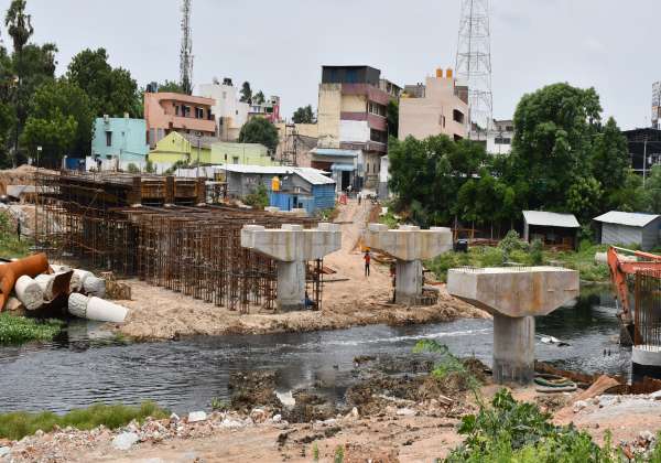 மதுரவாயல் கூவம் ஆற்றின் குறுக்கே கட்டப்பட்டு வரும் உயர் மட்ட மேம்பால பணிகள் ஜரூராக நடந்து வருகிறது. இடம் : சின்ன நொளம்பூர்