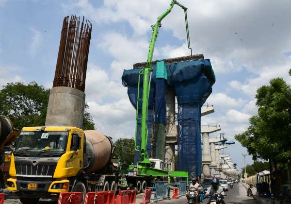 மவுண்ட் பூந்தமல்லி சாலை போரூர் அருகே மெட்ரோ ரயில் பாதைக்கான தூண்களில் சிமெண்ட் கலவைகள் போடும் பணி நடைபெற்று வருகிறது.