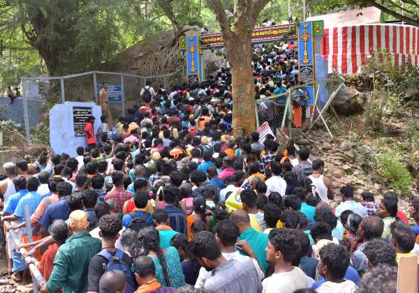 ஆடி அமாவாசை முன்னிட்டு சதுரகிரி சுந்தரமகாலிங்கம் கோயிலில் சுவாமி தரிசனம் செய்ய நுழைவு வாயிலில் திரண்டிருந்த பக்தர்கள்.