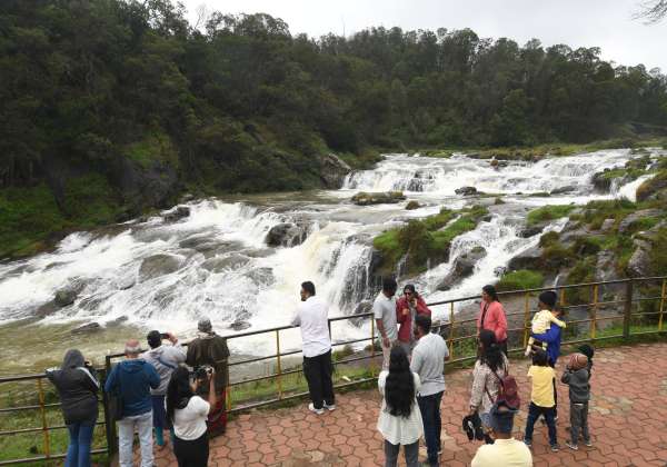 ஊட்டி அருகே பைகாரா நீர்விழ்ச்சிக்கு, ஏராளமான சுற்றுலா பயணிகள் வந்தனர்.