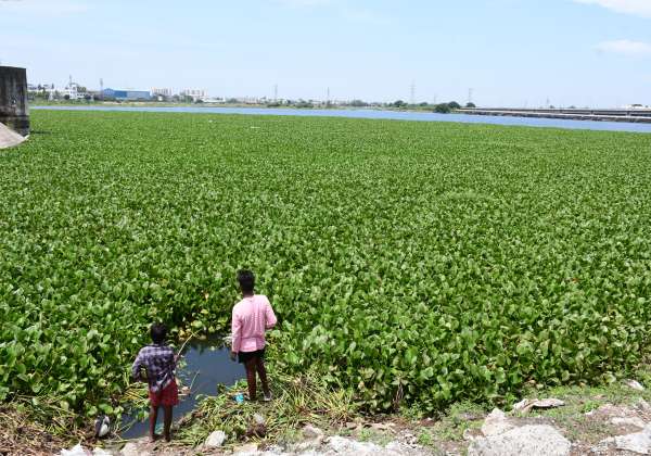 போரூர் ஏரியில் படர்ந்துள்ள ஆகாயத்தாமரை செடிகளை சிறிதளவு அகற்றிவிட்டு மீன் பிடிக்கும் சிறுவர்கள்.
