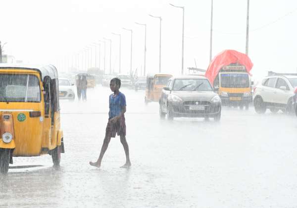 சென்னையில் மதிய வேளையில் திடீரென கரு மேகங்கள் திரண்டு மழை பொழிந்தது மழையில் நனைந்து படி செல்லும் சிறுவன் மற்றும் வாகன ஓட்டிகள். இடம்: சாந்தோம் லூப் சாலை.