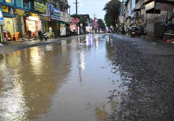 திண்டிவனத்தில் பெய்த மழையால் ராஜாஜி வீதியில் பாதாள சாக்கடை பணிகள் முடிந்தும் சாலை அமைக்காததால் மழையில் ஜெல்லிகல் பெய்ந்து குண்டும், குழியுமாக காட்சி அளிக்கிறது.