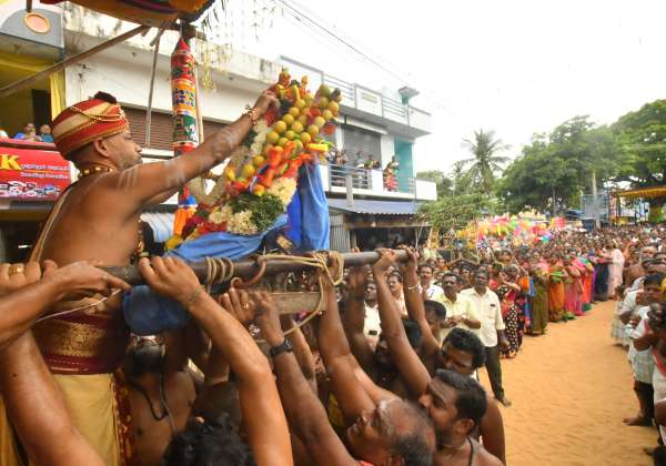 ஆடித் திருவிழா யொட்டி ராமேஸ்வரத்தில் பர்வதவர்த்தினி அம்மனுக்கு கோயில் குருக்கள் மாலை மாற்றும் நிகழ்ச்சி நடத்தினார்.