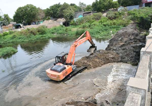 திருப்பூர் நடராஜ் தியேட்டர் ரோட்டில் நடக்கும் பாலம் கட்டுமான பணிக்காக, நொய்யலாற்றில், தண்ணீரை திருப்பி விட, தற்காலிக தடுப்பு அமைக்கப்படுகிறது.