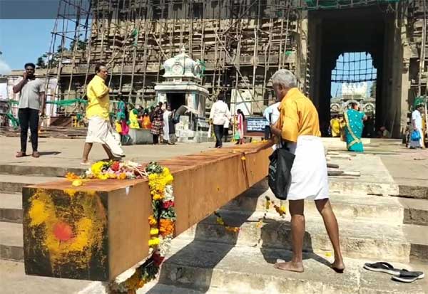 தென்காசி காசி விஸ்வநாதர் சுவாமி கோயிலில் கும்பாபிஷேகத்திற்கான பணிகள் நடக்கிறது. சுவாமி மற்றும் அம்பாள் சன்னதிகளில் புதிய கொடி மரங்களுக்கு வெளிநாட்டிலிருந்து வேங்கை மரங்கள் கொண்டு வரப்பட்டன.